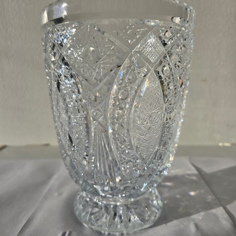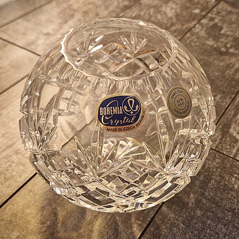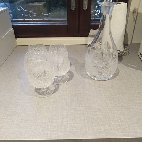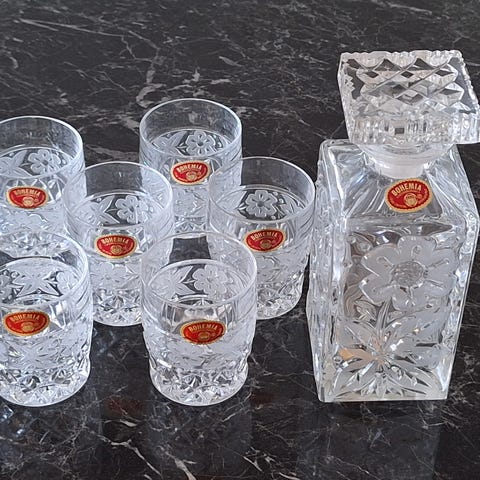 Tsekkoslovakiakasta Bohemia kristallinen karahvi ja 6 lasia. Käyttämättömät. Tsekkoslovakialainen kristalli viittaa perinteisesti laadukkaaseen, usein 1900-luvulla valmistettuun kristalliesineistöön. Se tunnetaan korkeasta laadustaan, selkeydestään ja usein taitavista leikkauksistaan, käsin leikattu, ja se on suosittu keräilykohde niin huonekaluissa kuin muissa koriste-esineissäkin.