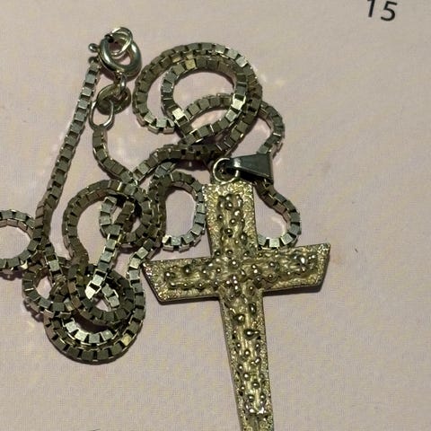 Ristin pituus lenkistä 37 mm, halkaisija 28 mm x 27 mm, ketjun pituus 48,5 cm, ketjussa käytönjälkiä (tummentumaa).