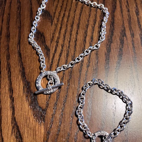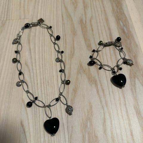 Hopeisen väriset kaula- ja rannekoru. Kaulakorussa on hieman tummentumaa, kuten kuvasta huomaa, mutta tämän saa luultavasti pois.