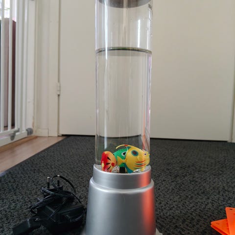 Myydään uusi pieni ylösalaisin käännettävä koristeakvaario. Ei aukea. Ylä-ja alaosassa yksi 'kala' kummassakin. Korkeus 11 cm halkaisija 5 cm.