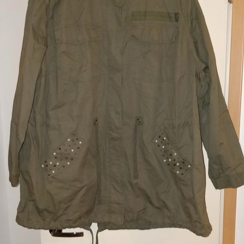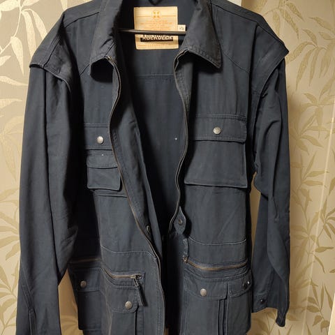 Tummansininen puuvillakankainen ohut takki hupulla. Helmassa ja hupussa kiristysnyörit. Edessä taskut. Toisesta hihasta puuttuu yksi nappi.