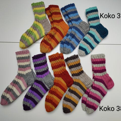 Käsin neulotut raidalliset sukat Novitan Raita-langasta lahjaksi tai omia varpaita lämmittämään.