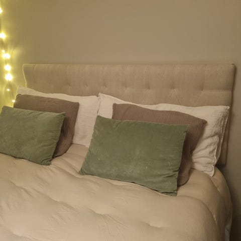Myydään verhoiltu sängynpääty niittikoristeilla