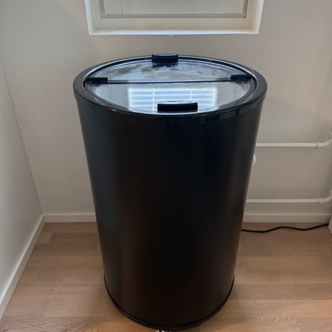 Kannellinen kokonaan musta pyörillä varustettu kylmätynnyri n. 100:lle tölkille.