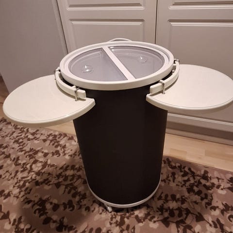 Sisältä löytyy kaksi erillistä koria, joten kun ylempi on tyhjennetty, saa helposti vaihdettua kylmät juotavat tilalle ja uudet pistettyä toiseen koriin alle viilenemään.