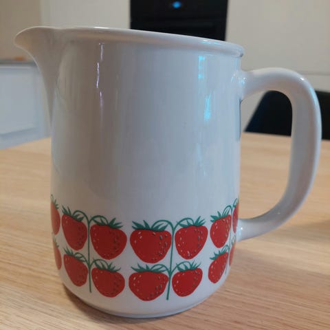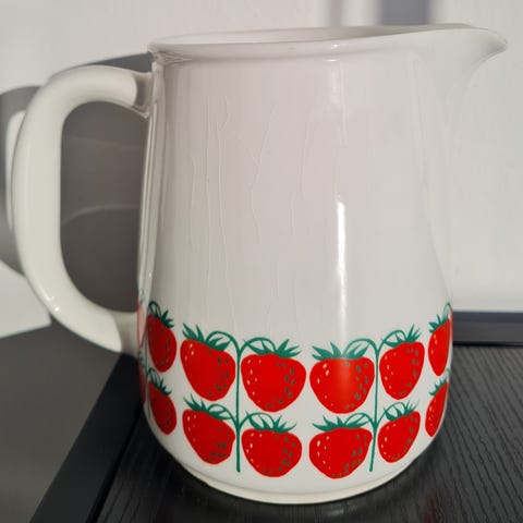 Arabia maitokannu, Pomona, mansikka. Design, Raija Uosikkinen. 1960-luku. Korkeus 15cm, suun halkaisija nokan kohdalta 13cm.