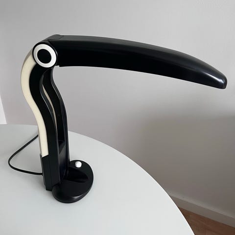 Ikoninen H.T. Huangin suunnittelema Toucan-pöytävalaisin 1980-luvulta. Säädettävä pää ja leikkisä muotoilu.