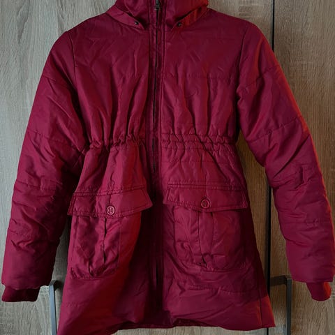 Sininen, lämmin toppatakki, huppu neppareilla, vetoketjut taskuissa ja edessä, + nepparit vetoketjun vieressä. Koko 146.