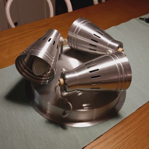 1990-luvun saksalaista muotoilua edustavat oikein hyväkuntoiset kattovalaisimet. 4-haaraisessa 4*20 W ja 2-haaraisessa 2*35 W halogeenilamput.