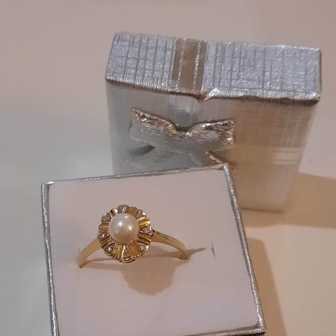Myydään helmisormus pikku timanteilla. Keltakulta runko, leimat löytyy, sormuksen koko 16