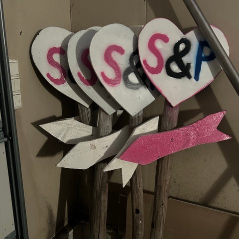 Yhdet maalaisromanttiset häät juhlineita tarvikkeita. Käyttämättä jääneet paperiset "love is sweet" pussukat. Niiden lisäksi settiin kuuluu photo booth tarvikkeita, parit viirit, lilan ja punaisen värisiä tekokukan terälehtiä, neljä viinilasia ja kuvasta puuttuvat vaneriset love koristeet, joita paketoimme vieraslahjoiksi ja niitä jäi yli.