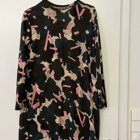 Myydään Marimekon pusero, värikästä kuosia, jonka nimi ei ole tiedossa. Joustamatonta puuvillaa. Niskassa ja ranteissa napit. Ei taskuja. Varanappi tallella.