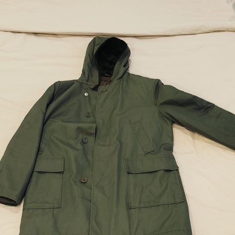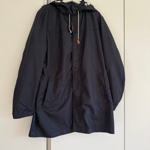 Laadukas kaksiosainen ulkotakki. Puuvillapolyeste-kuoritakki, parka-mallinen. Sisätakkina kevytuntuvatakki. Sisätakki kiinnittyy neppareilla ulkotakkiin. Ei reikiä eikä tahroja, ainoastaan sisätakin ripustuslenkki irti toisesta päästä.