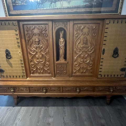 Tästäpä tukeva vanha kaappi. Oletan tämän olevan korkean kaapin yläosa, mutta nyt siis alaosana. Takalevyn sisäpuolen alaosa on kyllä huonossa kunnossa, muutoin minusta kunto ok. Kaapin korkeus 100cm, leveys 90cm ja syvyys 50cm.
