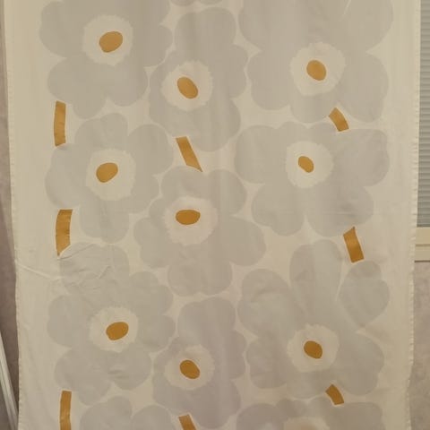 Käyttämättömät verhot 2 kpl . Kukaan värit perikka & tumma punainen hieman harmaata.