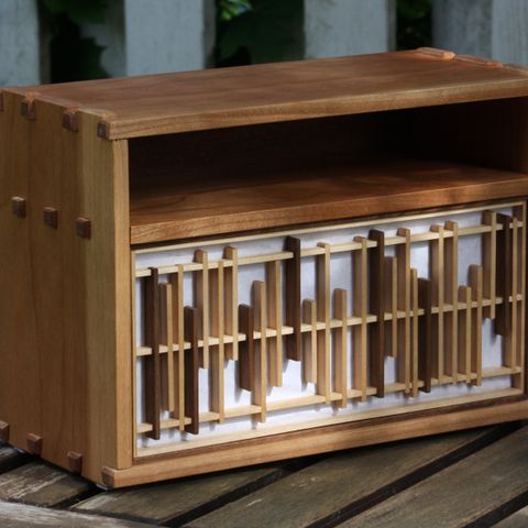 Käsin valmistettu pöytävalaisin jossa käytetty perinteistä japanilaista kumiko puutötekniikkaa. Rungossa käsin sahatut lohenpyrstöliitokset. Pintakäsitelty valkosävytetyllä öljyvahalla. Valona toimii pattereilla toimiva lednauha. Himmeä tunnelmallinen valaisin.