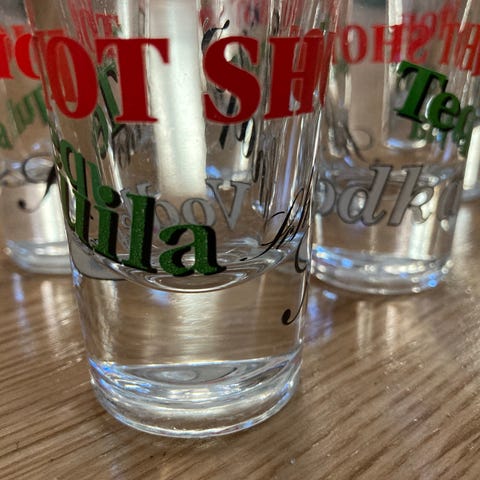 Myytävänä yhteensä 14 kappaletta paukkulaseja: neljä jalallista ja kymmenen lieriön mallista. Erinomaisessa kunnossa kaikki. Jalallisista shottilaseista kolme on keskenään samanlaisia ja neljäs on hivenen korkeampi, lieriön mallisista seitsemän on keskenään samanlaisia House-merkkisiä, kaksi keskenään samanlaista joissa pohjassa lukee P ja yksi Ikean lasi.