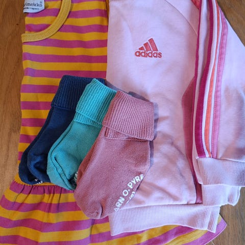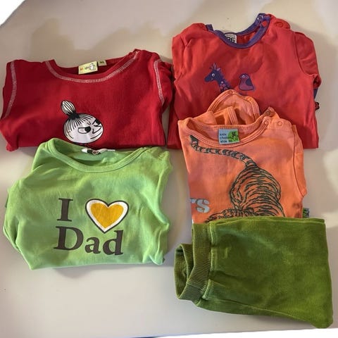 Ensimmäisen kuvan bodyt kunnoltaan moitteettomat, toisen kuvan bodeissa pinkissä ja raidallisessa pienet, mutta huomaamattomat reiät. Värikkäässä pienet tahrat, jotka näkyy vain oikein läheltä katsottuna. Valkoinen t-paitabody ja housut käytetyt, mutta hyvät. Merkkeinä mm. Metsola, Marimekko, Pomp de lux. Myyn vain settinä. Tuoksuton koti ja pesu.