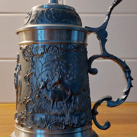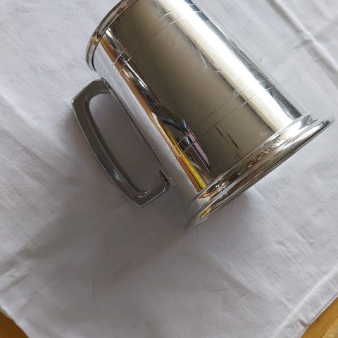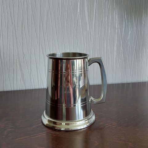 Kiiltävä ja koristeellinen metallituoppi; pohjassa teksti "Finest English pev. craftsman made Sheffield England. Korkeus 14,8 cm.