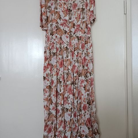 Kaunis kukkainen, miellyttävä materiaali, hyvin laskeutuva, tummanvihreä pohja, vaaleat kukat. Kokonapitus. Kivat taskut sivusaumassa.