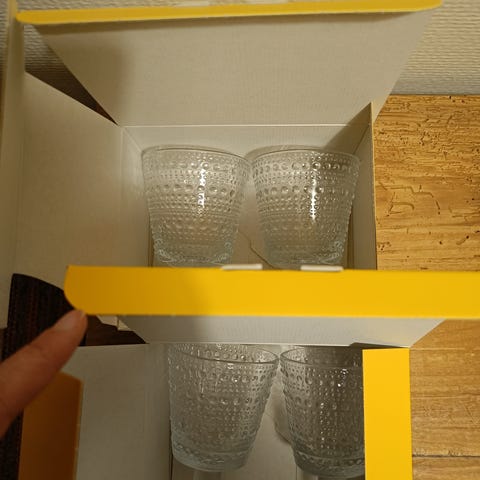 Iittalan kastehelmi kirkkaat paketissa olevat uudet juomalasit. Neljä kpl. Yhteensä 65 euroa.