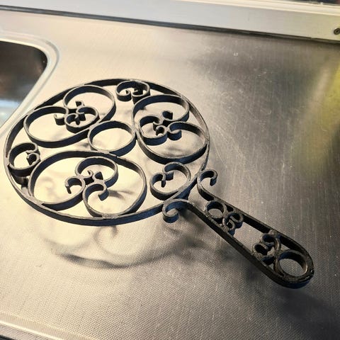 Vanha kaunismuotoinen pannu, ei uudenveroinen tietenkään. Korkeutta ilman kahvaa noin 17 cm ja halkaisija melkolailla saman verran.