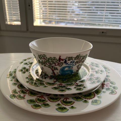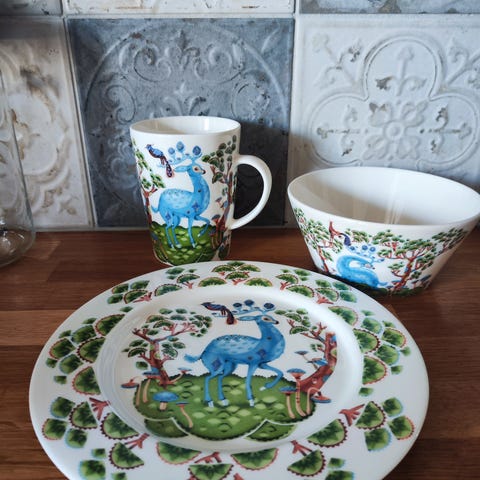 3 vuotta käytössä ollut Iittalan Satumetsä astiasto sisältää mukit, kulhot sekä ruoka- että leipälautaset. Mielellään koko astiasto kerralla 850€ mutta käy myös yksittäisten astioiden osto.