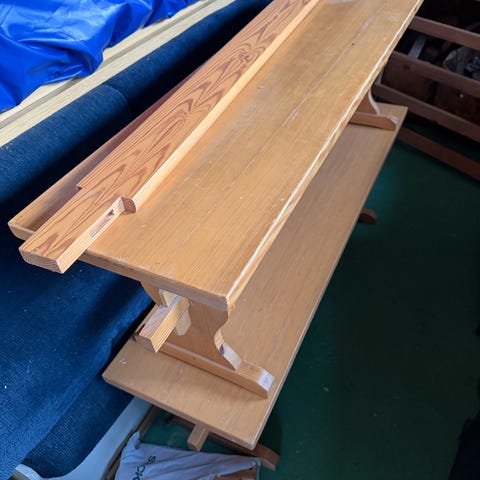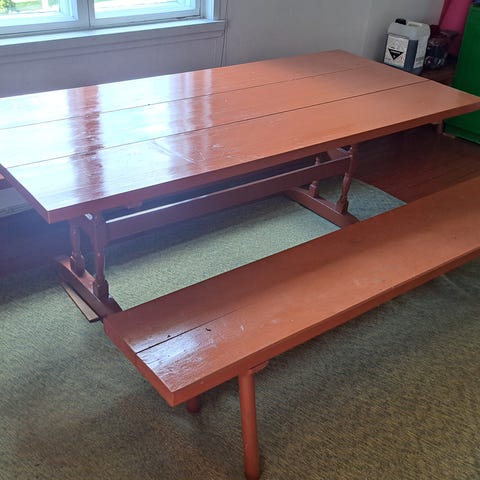 Vanha pirttipöytä, vihreä runkoinen. Pöytä- ja istuintasoille tehty katajankiekkopinta. Pöytätaso vaatii uutta lakkaa, mahdollista hiomista, mukaan saa vanhoja katajankiekkoja varaosiksi. Kuvat vanhoja, minkä vuoksi keltaisuutta (vaaleampi sävy päivän valossa). Pöytä tällä hetkellä purettuna.