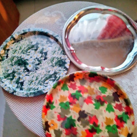 Kuvassa kauniita kukkia ja perhosia. Tarjottimen mitat: leveys n. 19 cm, korkeus n. 16 cm ja syvyys n. 1 cm. Paino muovipakkauksessa 56 g. Tekoäly arvioi, että tällisiä tarjottimia tehtiin 1970-1980 luvulla. Valmistajasta ei ole tietoa.