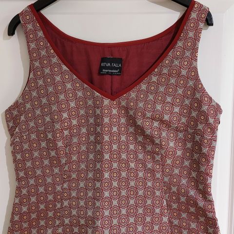 Marimekon toppi/tunika. Koko S. Värit musta, valkoinen, harmaa. 95 % puuvilla. Lantiolta nätti leikkaus ja helmoitus, takaa osa selkää avoimena ja olkaimet ristiin. Sopii kivasti myös jakun kanssa. Printti Kaarna, Design Mika Piirainen.