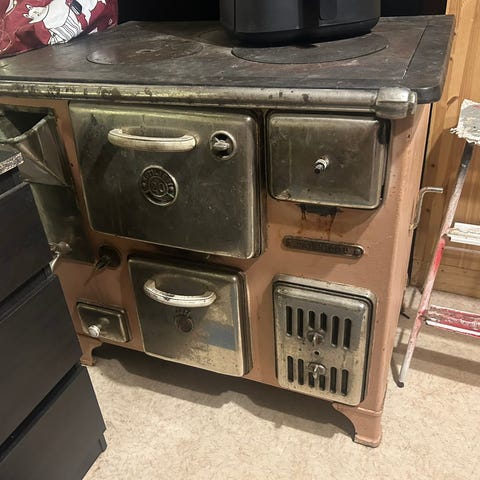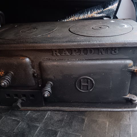 Vanha, kunnostettava valurautainen Högforsin hella.