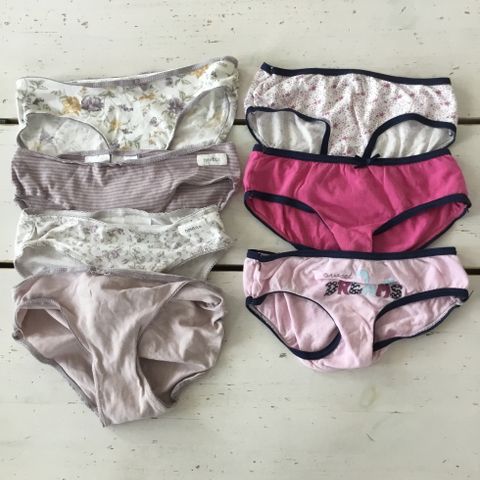 14 paria alushousuja, joista yhdeksät bokserit ja kolmet alushousut . Merkkeinä Me&i , Björn Borg , Pierre Robert , Next , My wear , House ja Disney. Mikki Hiiri -housujen kokona 120, mutta ovat pienemmät. Haalistumaa , sinisten Björn Borg -housujen haarasaumaan tullut reikä ja lähtenyt purkautumaan, pilvihousujen vyötäröstä kangas hajonnut ja keltaisten vyötärö resori hieman hajonnut ja vaaleampien oikeallaolevien alushousujen kuminauha aikas löysä (kuvat 2 ja 3), muuta mainittavaa ei osunut silmään. Nuo neljät joissa huomautettavaa saa mukaan halutessaan. Löytyi vielä yhdet 110 cm housut (kuva 4) ja yhdet 110/116 cm (kuva 5)