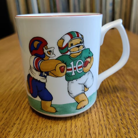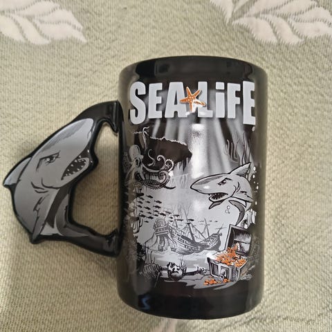 Merimiesaiheinen muki, leveällä pohjalla ja kannella