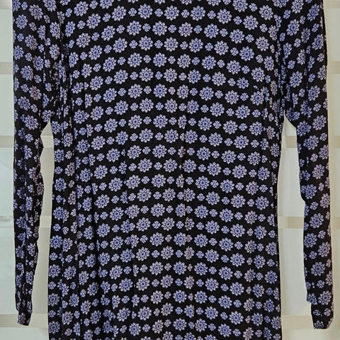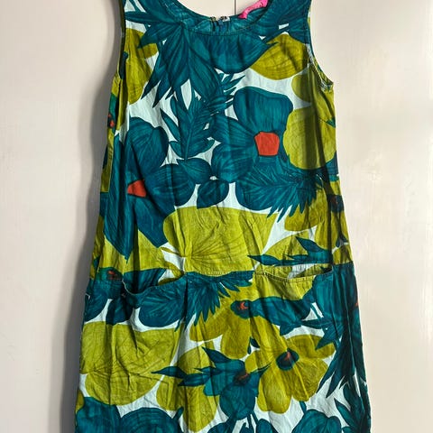 Indiskan mekko, koko M. Värit vihreä, valkoinen, ruskea, rosa. 50 % puuvilla, 50 % modaali. Yläosassa vuori samaa kangasta. Alaosa kuudesta osasta kelloon ommeltu. Nätisti toimii vaikkapa lavatanseissa eikä tule kuuma.