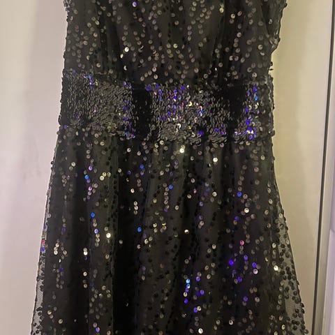 Gelco-merkin vuorellinen musta juhla- tai cocktailmekko. Koko L. 100% polyesteri.