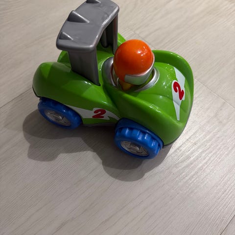 Leluauto vauvalle, merkki BR-lelut. Sisällä ”keinuva ukkeli”, jonka saa autosta irti. Pieniä naarmuja ja toisesta etuvalosta väri lähtenyt.