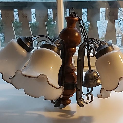 Turun Kristallin barokki kattokruunu. Korkeus n. 85 cm ja leveys n. 50 cm. Kuusi valopistettä. Muutama prisma irti mutta tallessa. Isoimmat kristallit noin 6 cm korkeita.