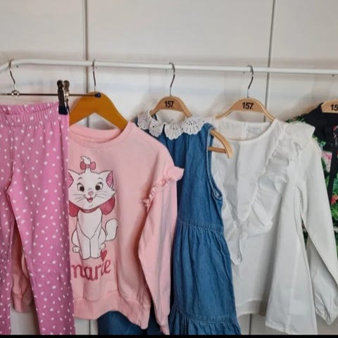 2 harmaata pitkähihaista, punainen ja vaaleanpunainen pitkähihainen, keltainen t-paita, mustat haalarihousut, punainen lyhythihainen neuletunika.