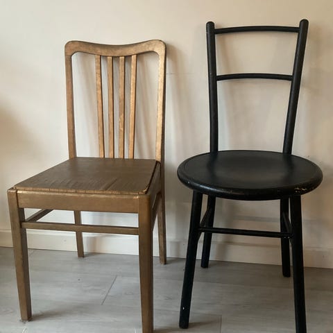 Kaksi vanhaa kaunista tuolia. Viiluvaurioita ja liimaa kaipaavia.