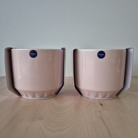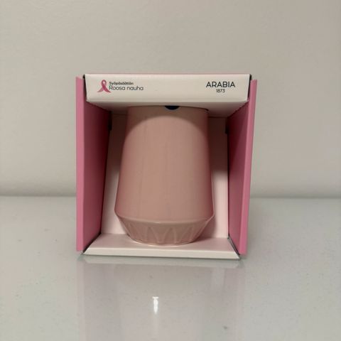 Alkuperäisessä pakkauksessaan Arabia Roosa nauha ruukku. Väri vaaleanpunainen. Koko 10x12cm.