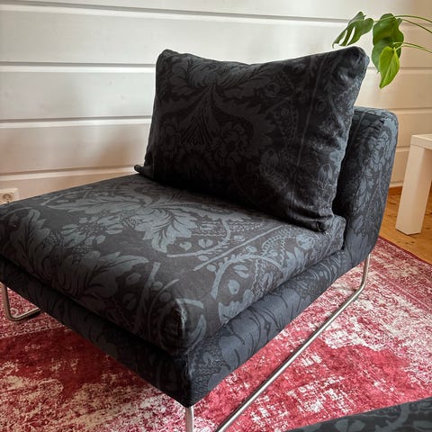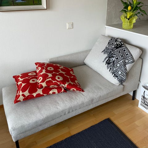 Erittäin vähäiselle käytölle jäänyt Suomessa valmistettu nojatuoli. Ainoat hyvin pienet käytönjäljet on mustissa metallijaloissa. Ollut vierashuoneessa lähinnä koristetyynyjen säilytyspaikkana. Uudenveroinen kunto. Imuroitu ja pyyhitty puhtaalla nihkeällä liinalla säännöllisesti. Koiratalous, mutta koira ei ole saanut olla nojatuolissa ja hyvin vähän samassa huoneessakaan tuolin kanssa. Hajuton, savuton ja hajusteeton, uusi asunto, jossa tuoli on ollut.