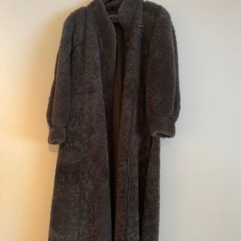 Materiaali aitoa paksua lampaanturkkia (takki painaa), kaulus ja hihansuut keinoturkista. Kuosi hieman teddymäinen.