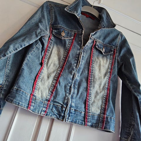 Hieman käytetty, hyväkuntoinen vaaleansininen farkkutakki.