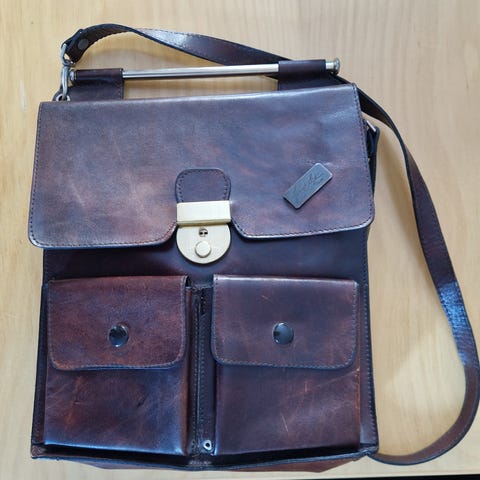 Vanha kätevä salkku tai olkalaukku. Hyvin pidetry, hyvässä kunnossa edelleen. Noin 37x31x16 cm. Postitus (11e) tai haku. Kulkee metrolla keskustaan saakka.