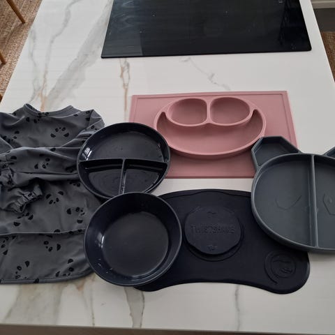 Hyväkuntoinen taaperon ruokailusetti eli muki ja lautanen.