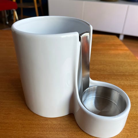 Kestää tiskikonepesun, siinä missä muutkin teräsastiat ja -tarvikkeet. ❤️ Telineen kuppi on irrallaan, joten helpottaa puhdistusta entisestään - ei esim. tarvitse aina pestä koko telinettä, jos vain kuppialusta on likainen. 🤗