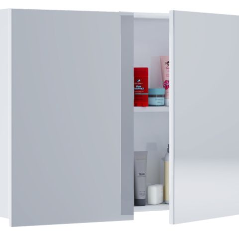 Käytytty, kuvien mukainen, valkoinen metallinen wc-tilan/kylpyhuoneen peilikaappi. Kaksi irrallista metallihyllyä, jotka ovat vaihdettavissa eri tasoille.