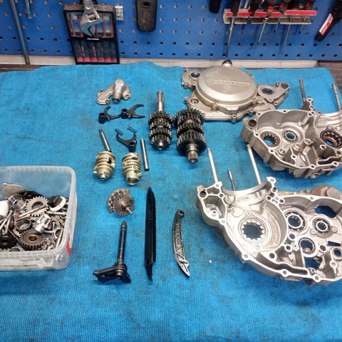 Kuvan pyörä osina. Moottori kokenut öljypumppu vaurion ja ainakin kansi käyttökelvoton, muuta moottorista ei ole purettu. Pyörässä tunteja noin 140.