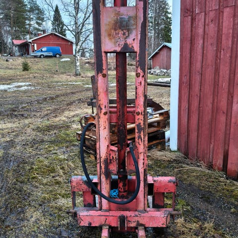 Toimintakuntoinen takakuormaaja lumikauhalla ja trukkipiikillä. Trukkipiikki itse tehty