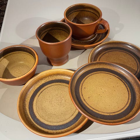 Neljä Iso-pahkalan teekuppia. Kupin halkaisija vajaat 11 cm ja korkeus noin 7 cm. Lautasen halkaisija noin 16 cm.